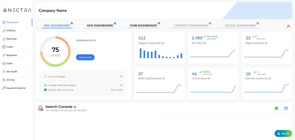 Every Nectra client gets a live portal — updated daily — where you can track rankings, traffic, conversions, and what we’ve done for you.